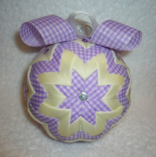 Ozdoba je zdobená stuhami v barvě fialové káro a slonová kost.