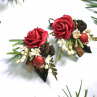 Vyrobeno z červené papírové růžičky, šišky, sušených a umělých lístečků a bobulek připevněných na kovovém náušnicovém lůžku.