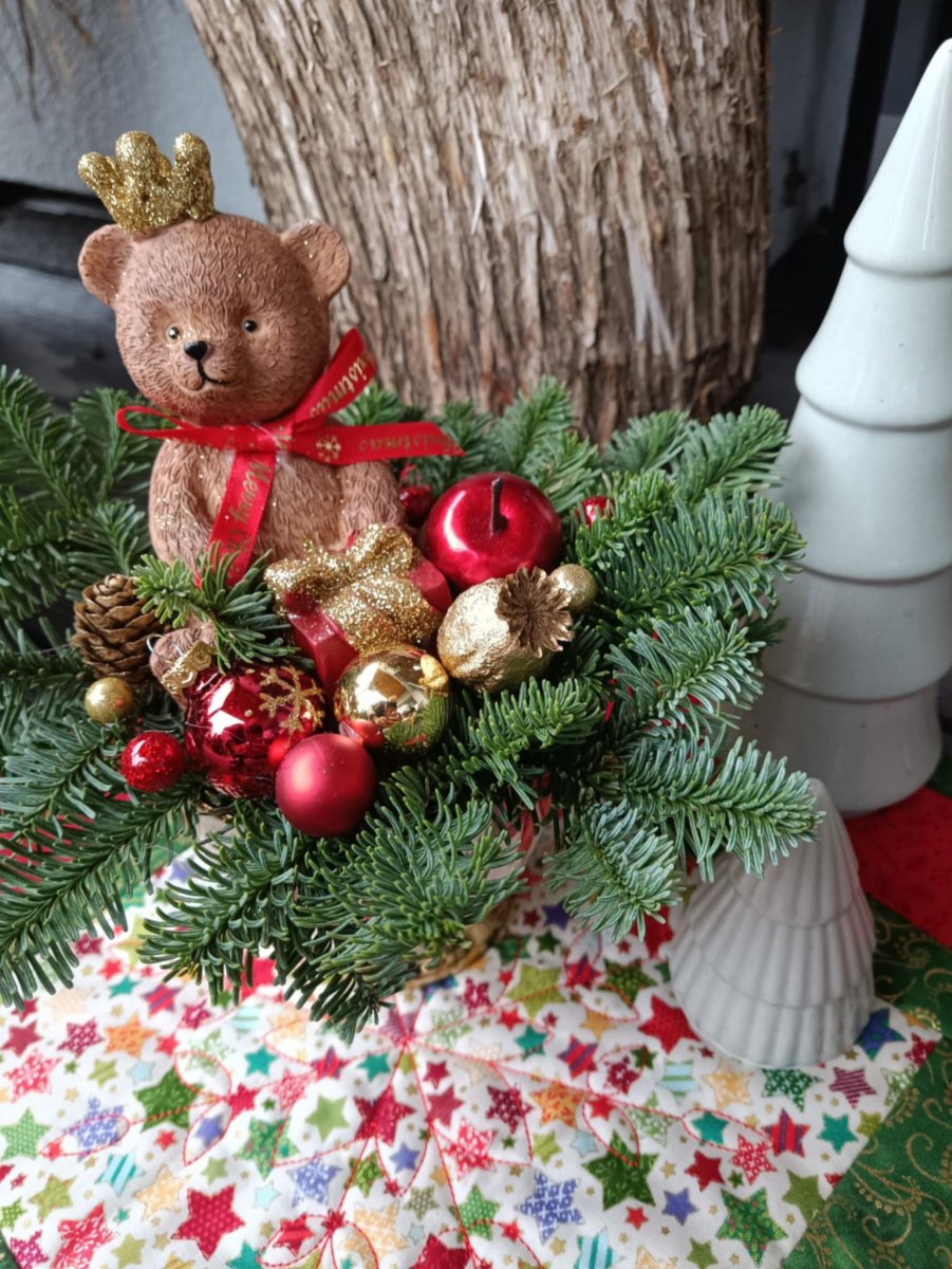 Nabízím originální vánoční aranžmá v hrníčku s ouškem, zdobené čerstvou jedlovou zelení a výraznými červenými a zlatými ozdobami. Dominantou dekorace je roztomilý medvídek s třpytivou korunkou, který dodá celému aranžmá hravý, ale zároveň elegantní sváteční vzhled.