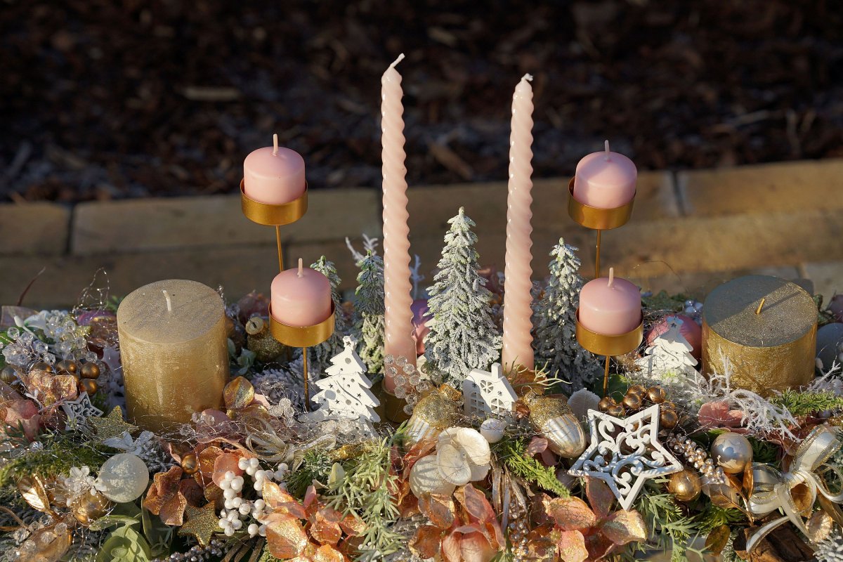 Dlouhý vánoční svícen v kombinaci růžové a zlaté barvy. Několik druhů svíček, umělé chvojí ve 3D kvalitě, krystalky, baňky, bobulky, zlacené listy.... Rozměr svícnu 78x30cm, výška po knot vysokých svíček je 34cm.