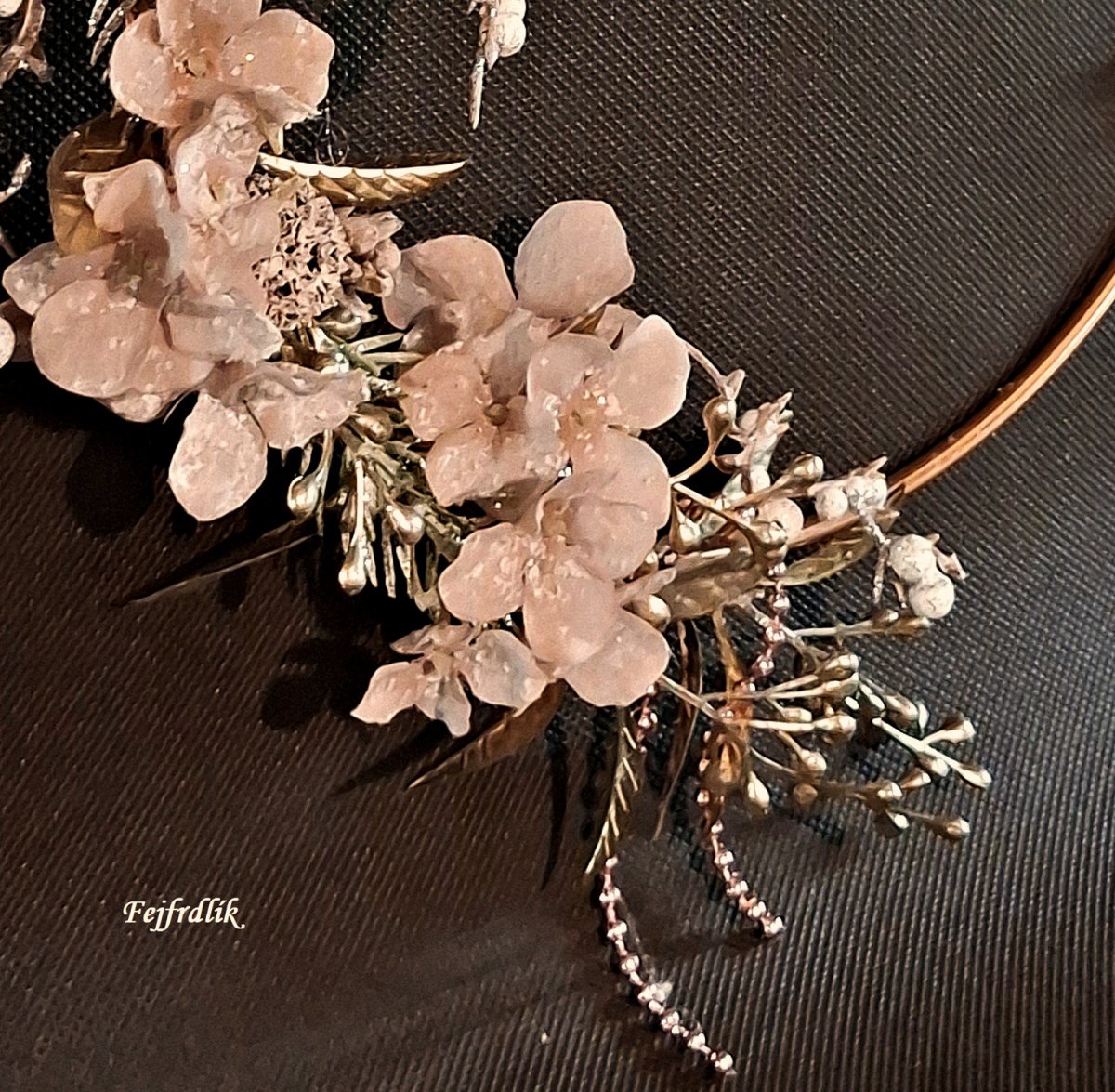 Originální vánoční věneček na kovovém kruhu se zavšeným dřevěným stromečkem s ozdobou, umělými zasněženými hortenziemi a ostat.přízdobami.
