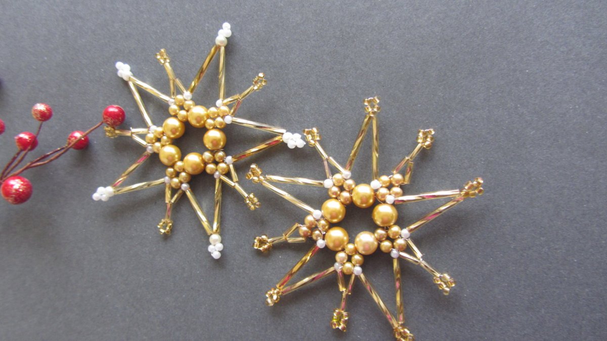 Vánoční drátkované hvězdičky ve zlaté barvě jsou zhotoveny ze směsi skleněných korálků. Velikost hvězdičky je 8,5 cm. Hvězdičky se od sebe liší. Jedna má kombinaci s bílými korálky.