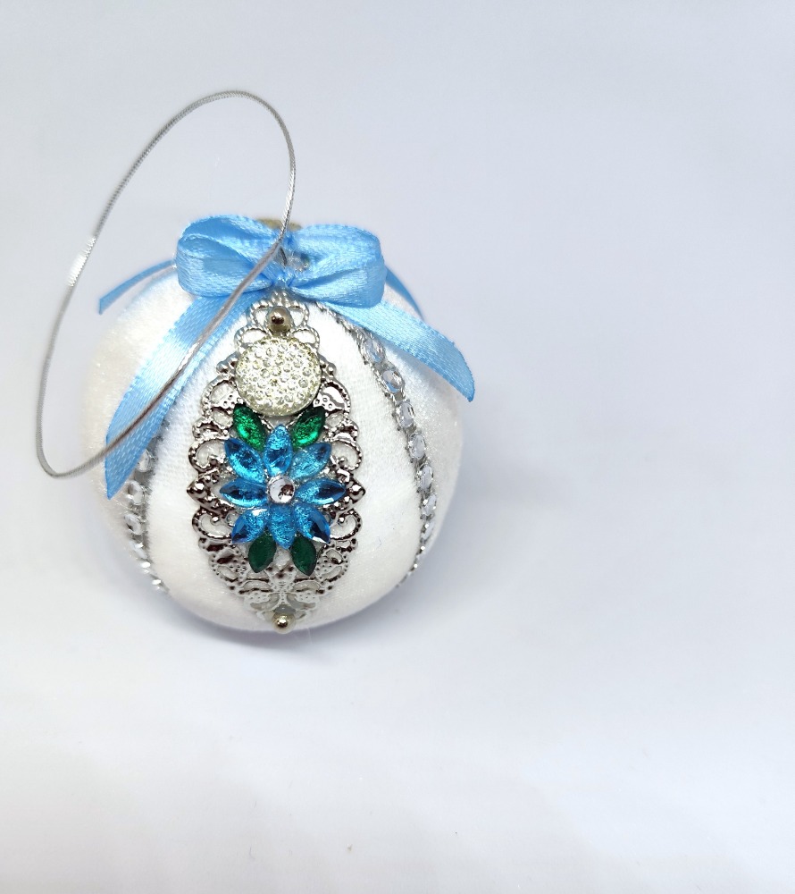 Použitý materiál :bílí samet, stříbrné a modré kamínky ,stříbrné brože , mašle .
