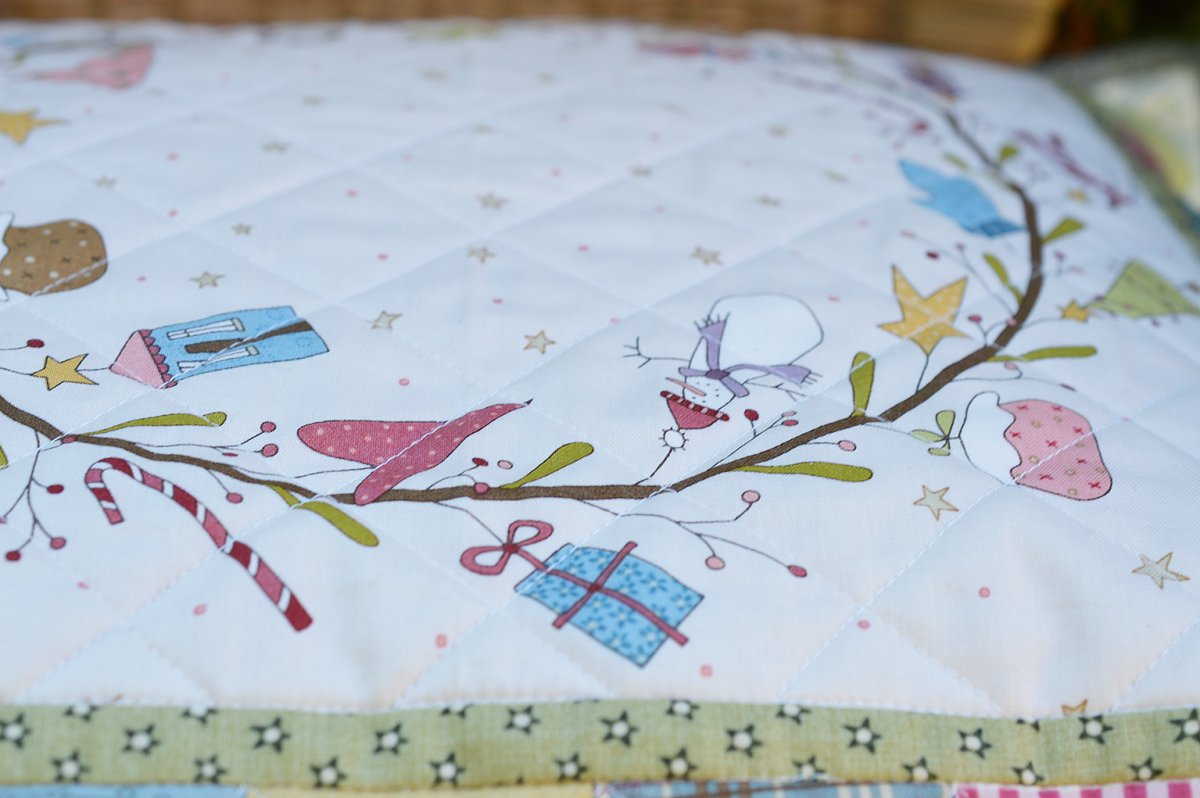 Střed tvoří tištěný panel s motivem vánočního věnečku, doplněný o pečlivě sladěný lem, složený z bavlněných čtverců v přírodních a pastelových tónech.