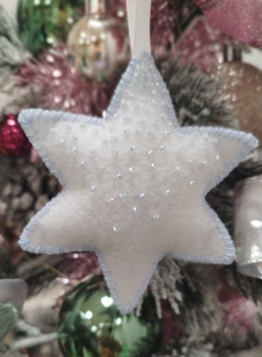 Vánoční hvězdička, bílá se světle modrým zdobením, ručně šitá z filcu, ozdobena perličkami