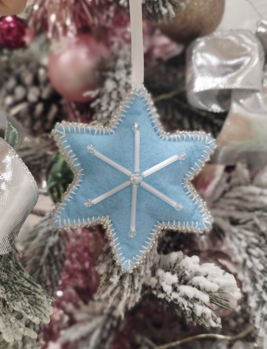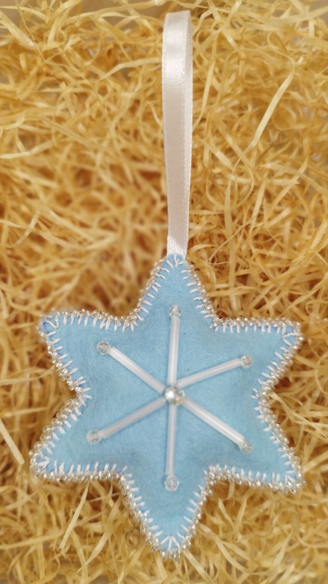 Vánoční hvězdička, světle modrá s bílostříbrným zdobením, ručně šitá z filcu, ozdobena perličkami