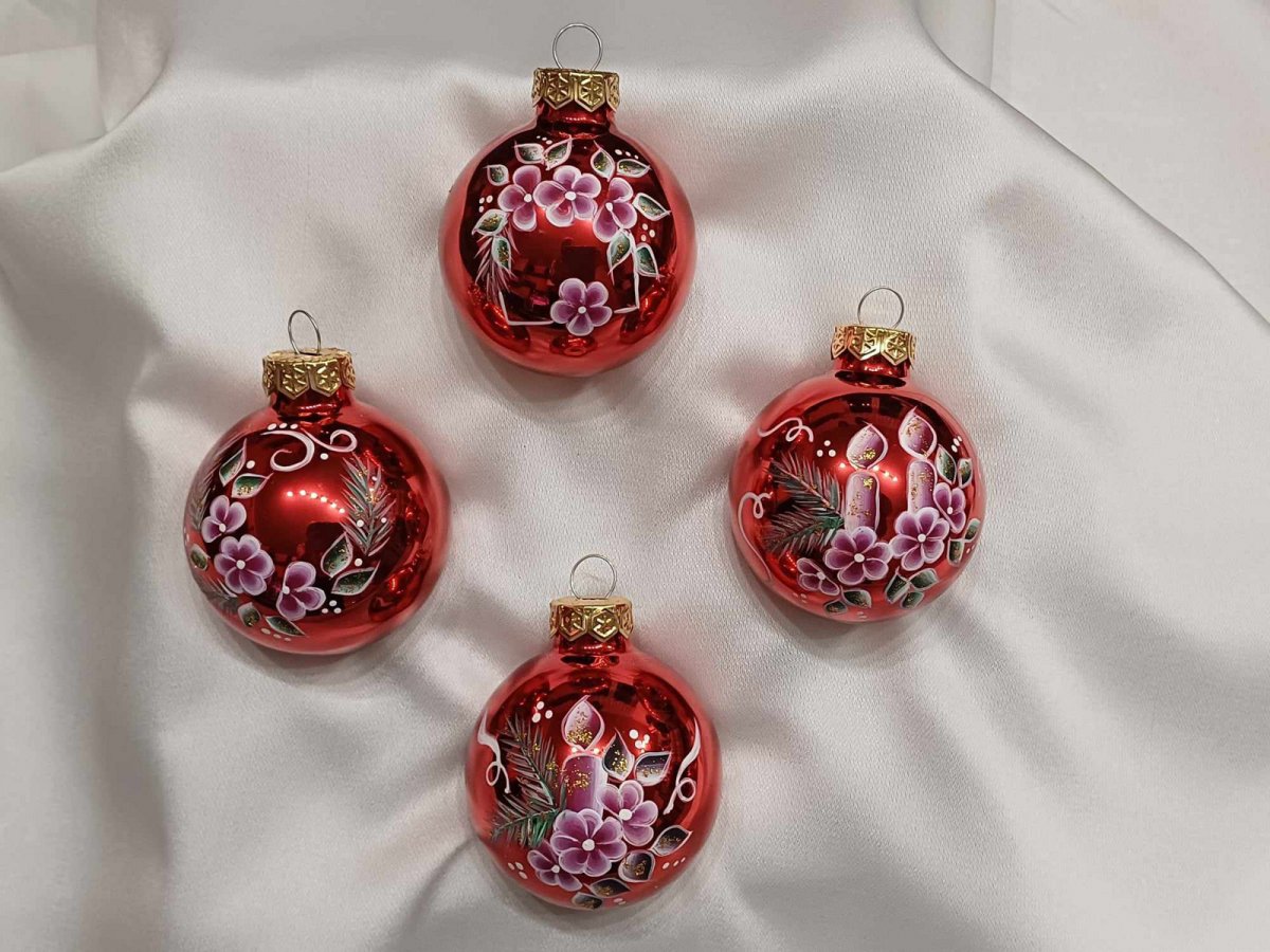 Skleněné vánoční kouličky, baňky průměr 6 cm, ručně malované technikou ONE STROKE + třpytky.Barva červená lesklá