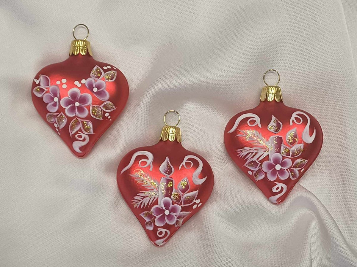 Skleněné vánoční srdíčka, ručně malované technikou ONE STROKE + třpytky.