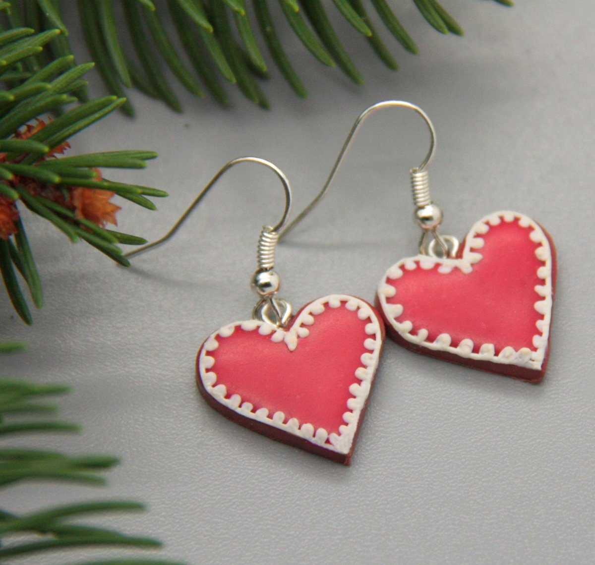 ručně modelovaný šperk z polymerové hmoty, zdobeno červenou polevou a bílým zdobením do podoby staročeských perníčků,