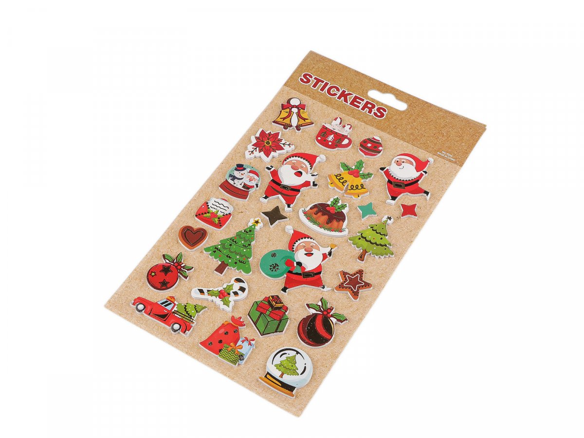 Samolepky s vánočními motivy mají kvalitní zpracování. Jsou plastické, se stylizovanými obrázky. Samolepjy jsou vhodné ke zdobení dárků, přáníček, pozvánek, krabiček, fotoalb apod. S oblibou je využívají i učitelé jako motivační odměnu pro své žáky. Samolepky jsou nalepené na jednom archu transparentní podkladové folie, ze které je stačí sejmout.