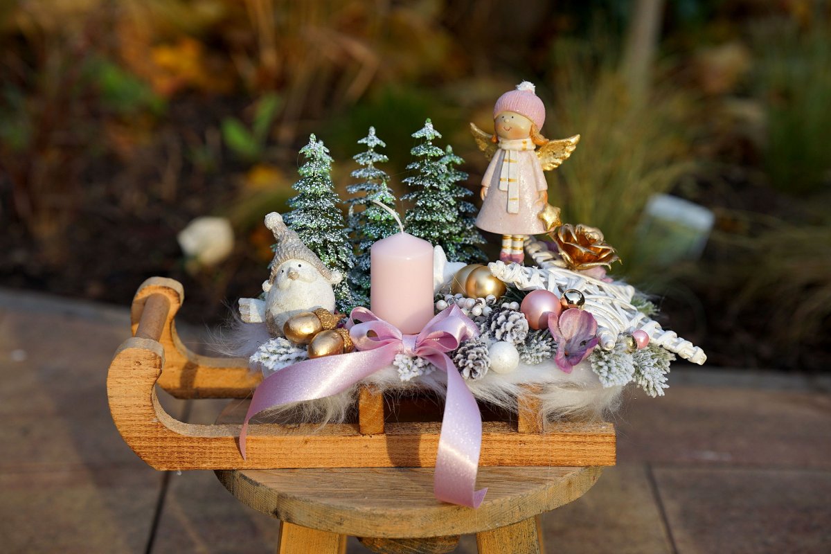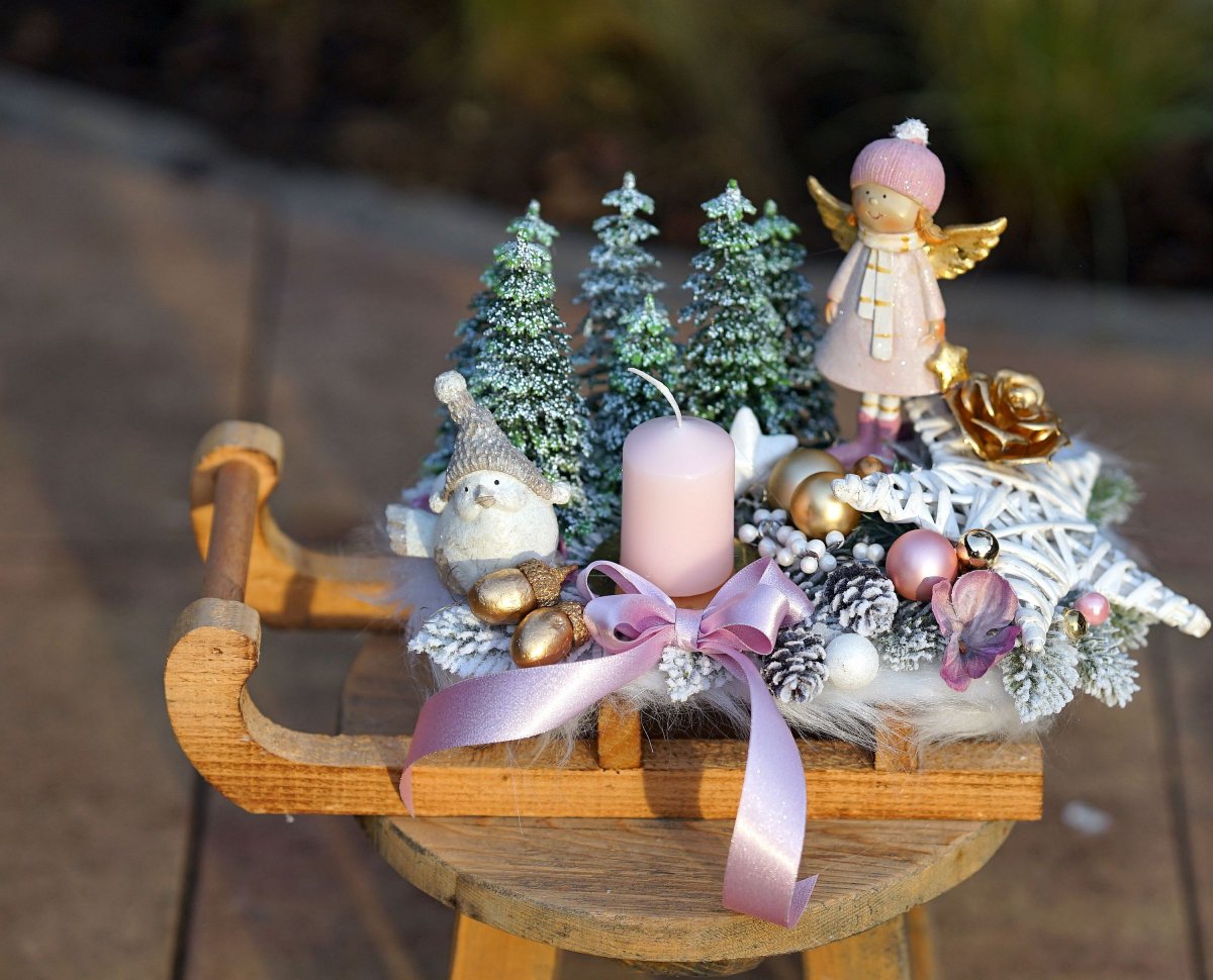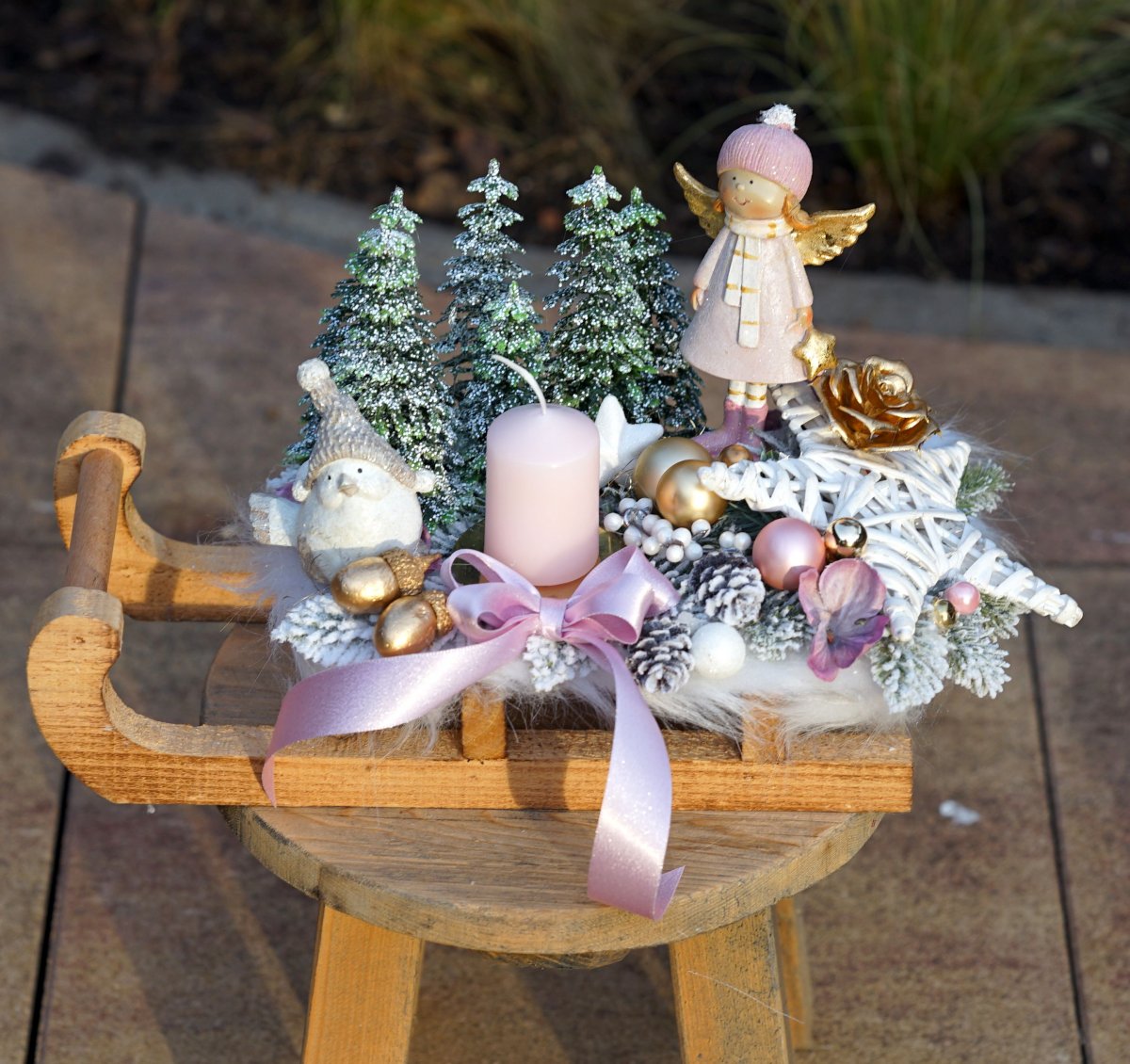 Dřevěné sáňky s andělkou, ptáčkem, svíčkou, stromečky, hvězdičkou a dalšími přízdobami. Rozměr sáněk je 36x18x21cm