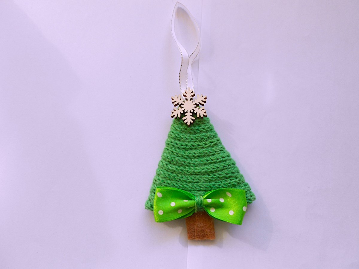 Ručně dělaná ozdoba vánočního stromku k zavěšení. Základ tvoří dvojitá lepenka obmotaná ručně pletenou dutinkou, zdobený dřevěnou hvězdou a mašličkou. Výška stromečku bez mašličky na pověšení 11cm, šířka v nejširším místě 8cm.