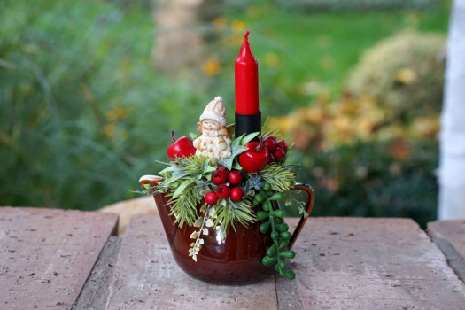 Vánoční svícen v keramické konvičce. Materiál je trvanlivý.