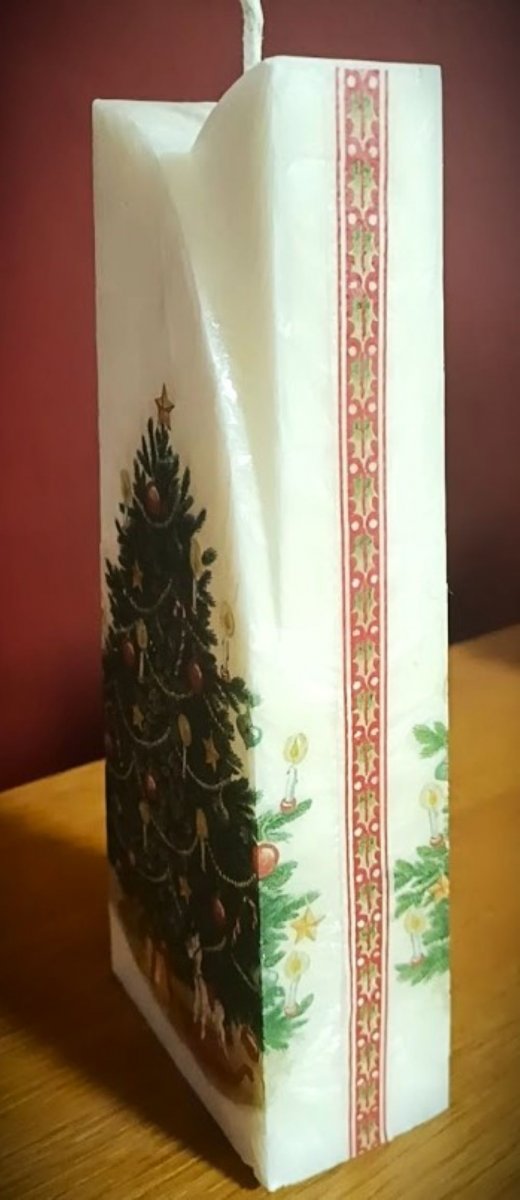 Rozměr 19 x 6,5 x 4 cm. Je z palmového vosku dozdobena technikou decoupage na vosk.