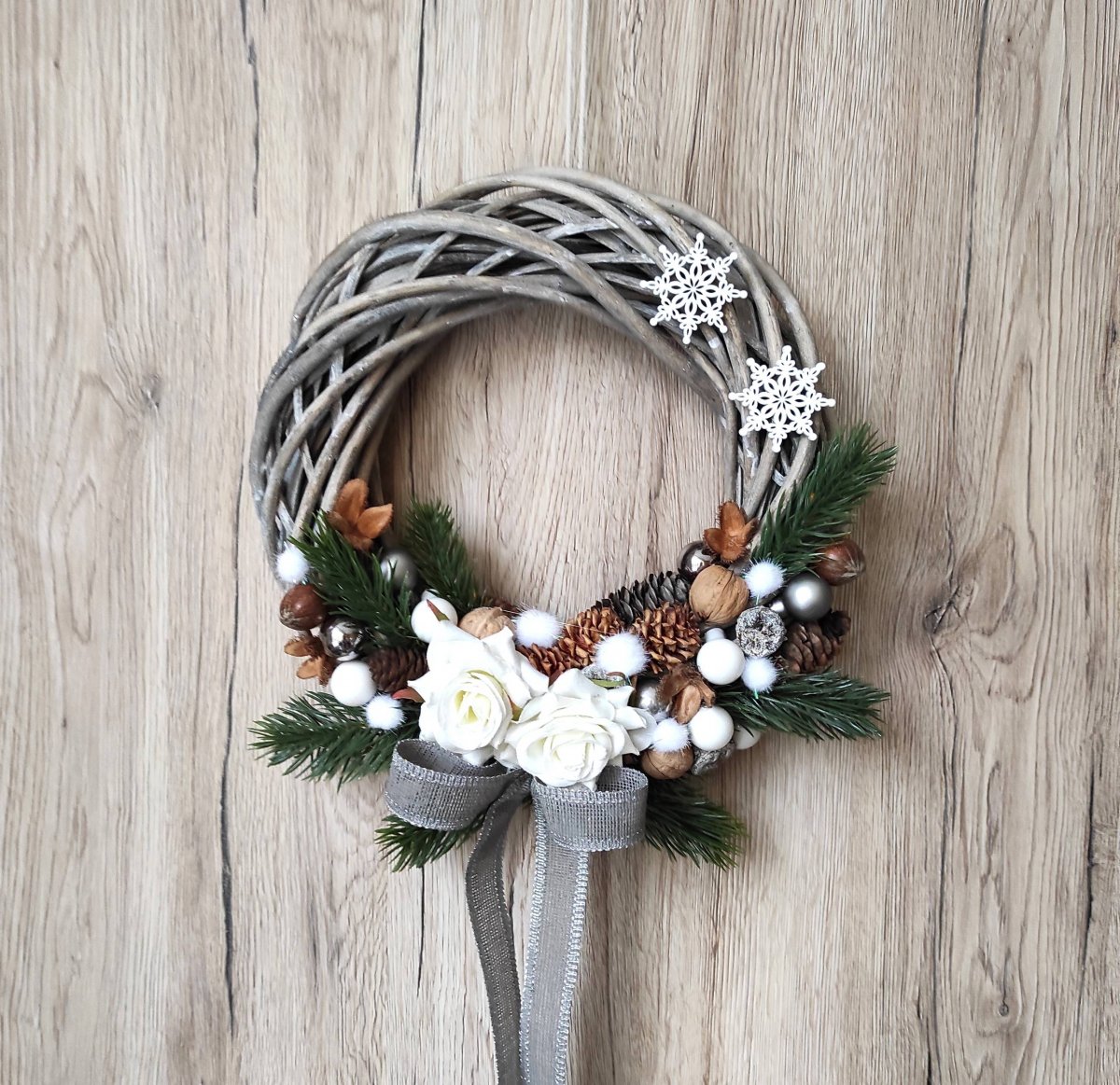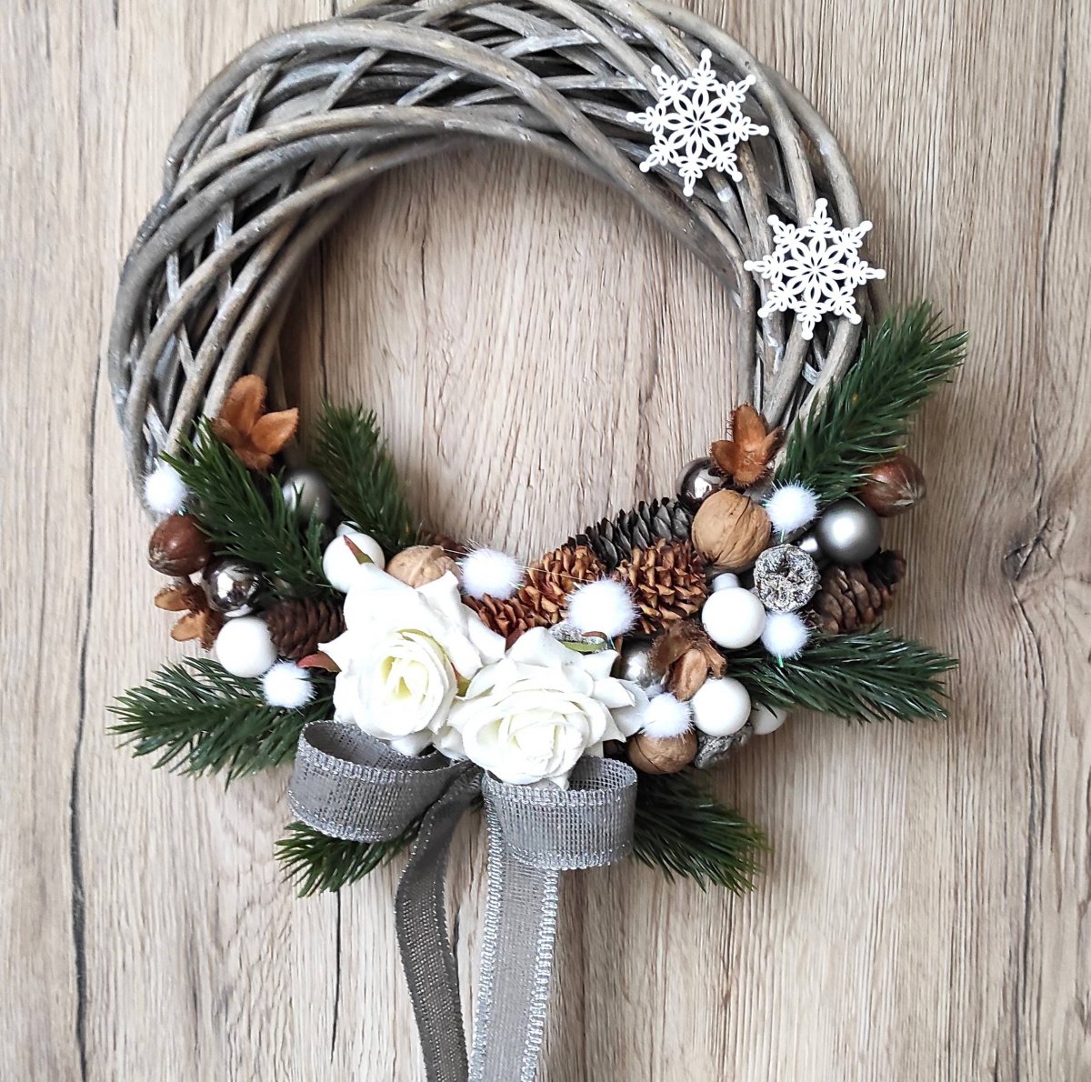 Vánoční věnec do šedobílého ladění na zavěšení na stěnu nebo na dveře. Je ozdoben kvalitními látkovými květy bílých růží,, umělými jehličnatými větvičkami, suchými plody, šiškami, ořechy, skleněnými bańkami a dalšími vánočními přízdobami.