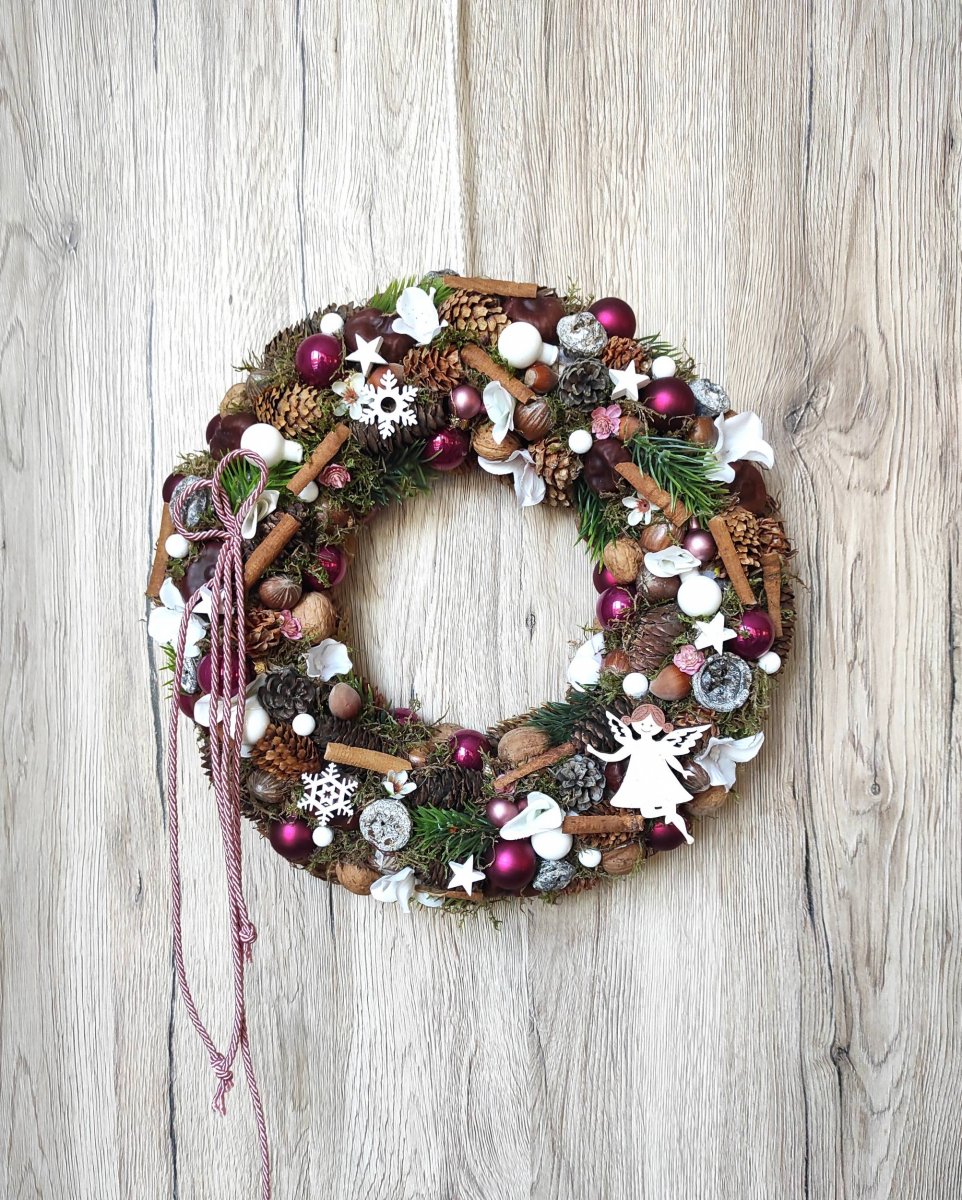Luxusní vánoční věnec laděný do růžové a bílé barvy. Věnec je nejen k zavěšení na stěnu nebo na dveře, ale i na položení na stůl nebo na komodu, kde jej lze uprostřed doplnit svíčkou.