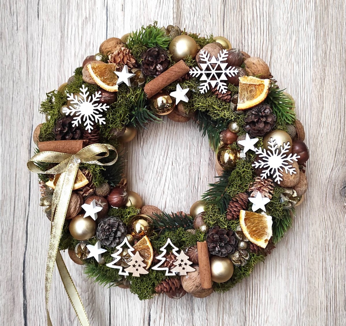 Krásný vánoční věnec laděný do barev zlaté a bílé. Věnec je určen nejen k zavěšení na stěnu nebo na dveře, ale i na položení na stůl, komodu apod.