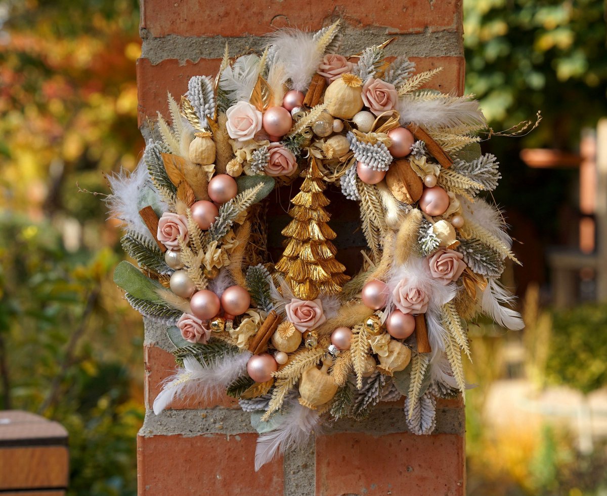 Vánoční věnec ve zlaté, růžové, smetanové a zelené barvě. Přírodní materiály, baňky, chvojí, stromek... to vše tvoří tento věnec o průměru 33cm.