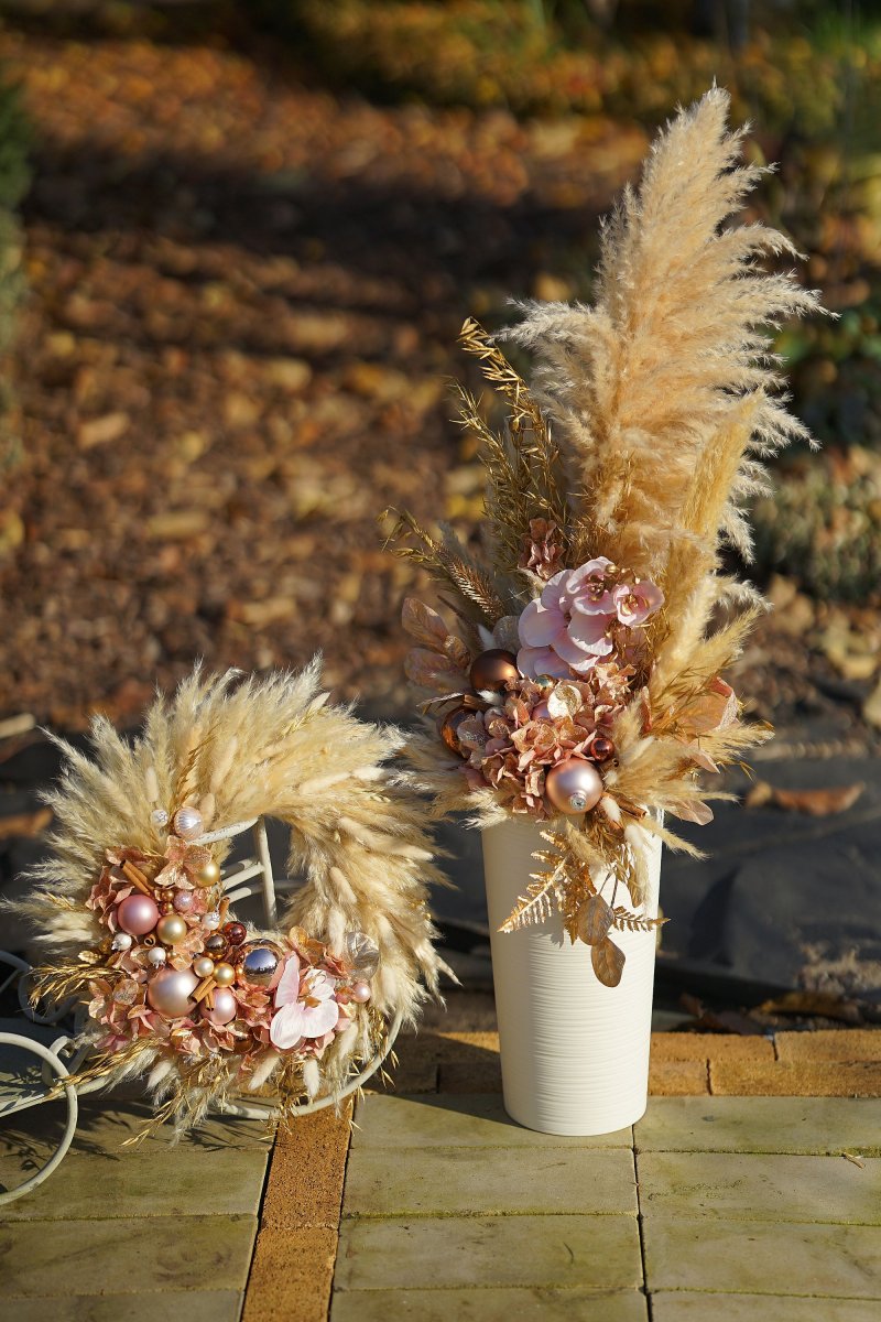 Vánoční dekorace ve vysoké plastové bílé nádobě. Pampová tráva, zlacený, oves, skořice, zlacená látková orchidej, zlacené květy hortenzií, baňky v růžové, zlaté a hnědé barvě a spousta dalšího materiálu. V nabídce najdete i věnec a stromek ve stejném stylu.