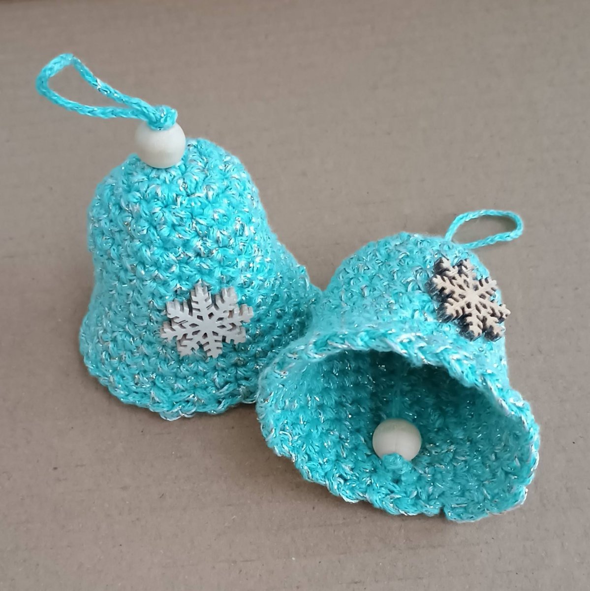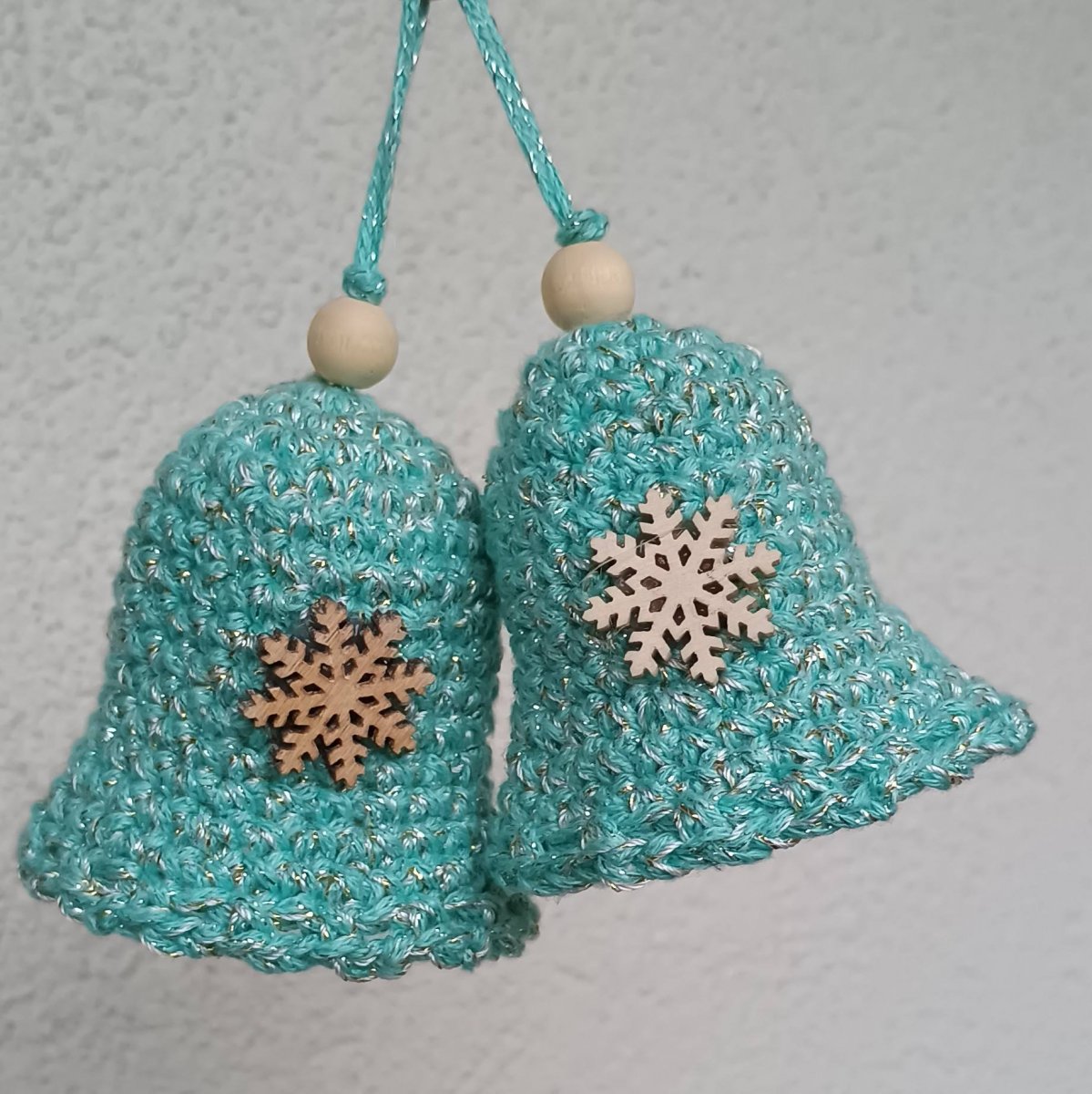 Sada dvou háčkovaných zvonečků k dekoraci, mají na výšku 6 cm a průměr 5cm, poutko s dřevěným korálkem k zavěšení.