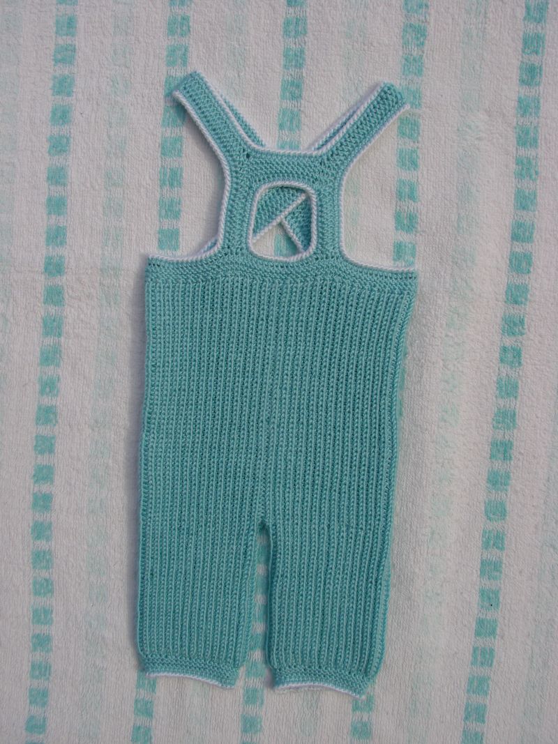 Kalhoty mají mentolovou barvu, pleteny jsou, jako i všechny další ostatní díly sady, na 5ti jehlicích, takže beze švů. Kšandičky se opět zapínají na zadní části na 2 knoflíky. Celá kaťata jsem obháčkovala bílou přízí.