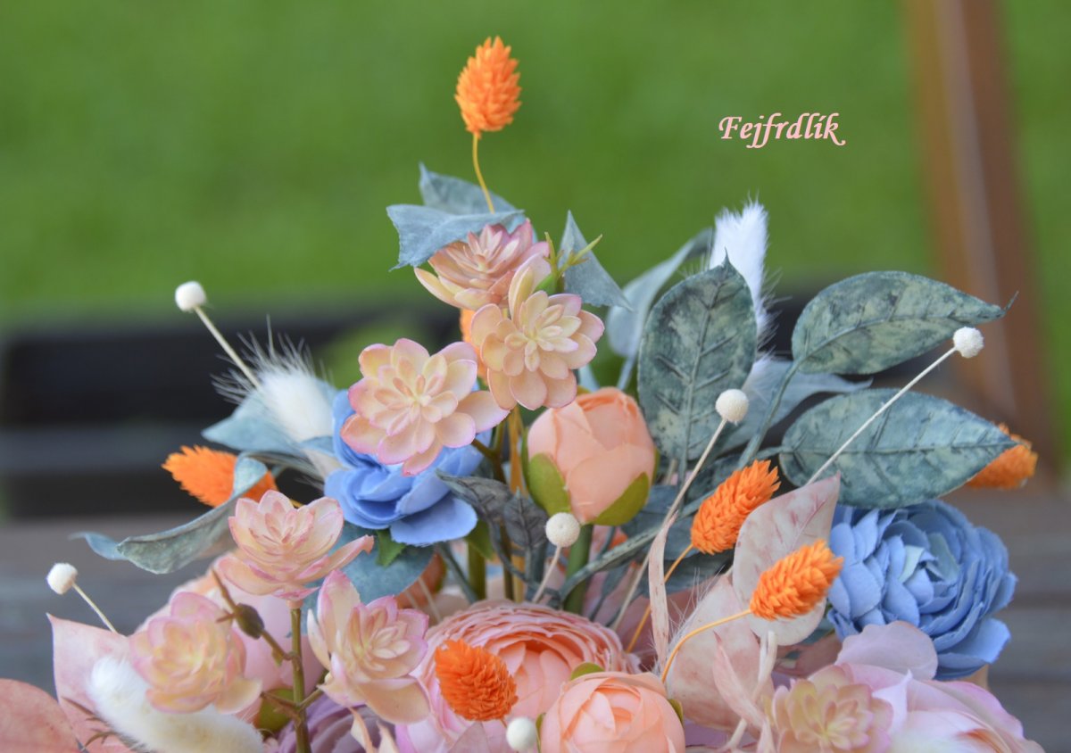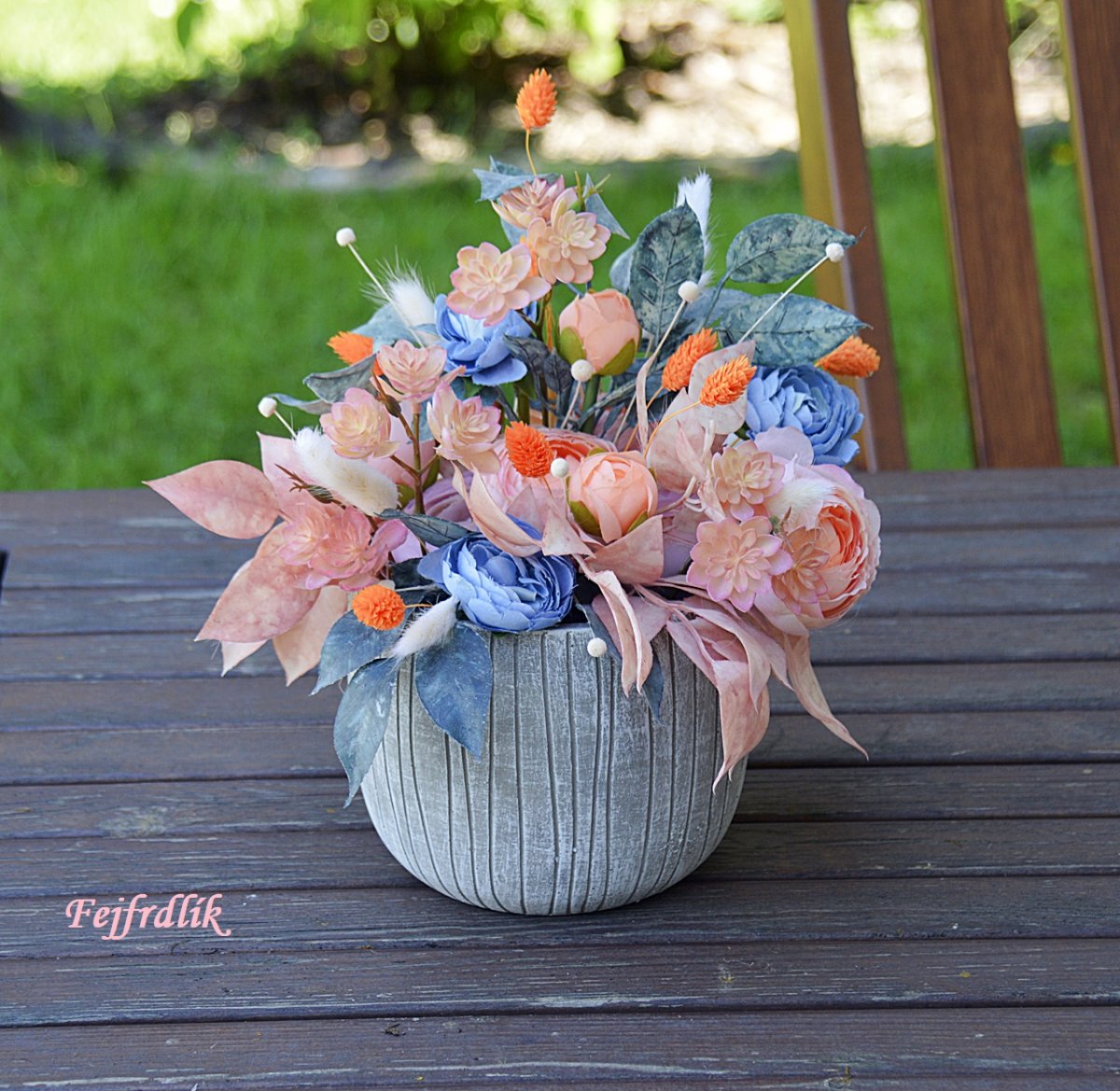 Betonový květináč s umělým listím fíkusu, květinami a sušinou.