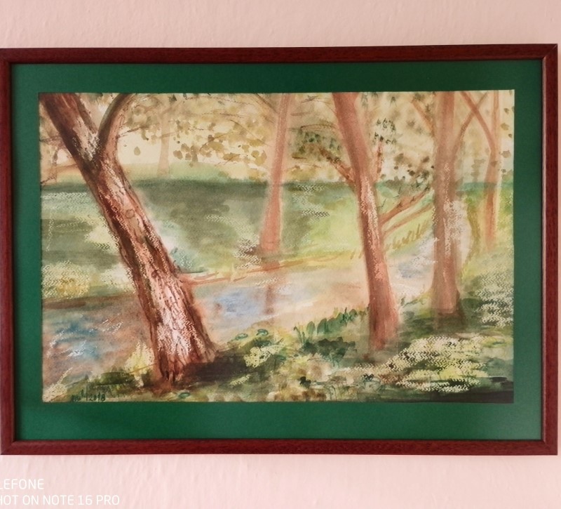 Obrázek s letním motivem krajiny kolem mojí oblíbené říčky malovaný akvarelovými barvami na strukturovaný akvarelový papír.