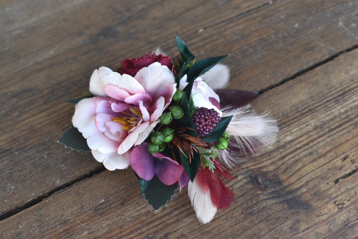Ozdoba je upevněna na kovovém skřipečku či broži a je vyrobena z vínových a růžových látkových květin, peříček, plastových a sušených bobulek a lístečků.