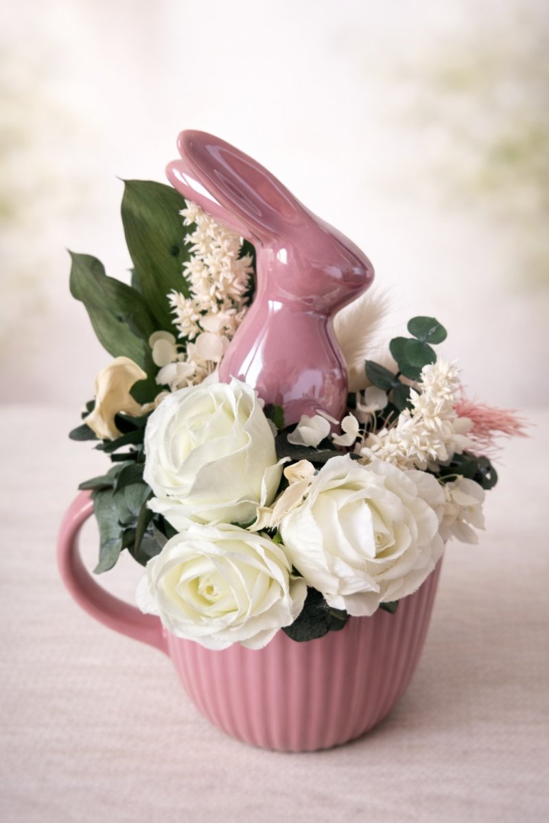 Keramický hrníček se zajíčkem, umělými a stabilizovanými květinami a zelení. Výška ařanžmá 23 cm, šířka 14 cm.