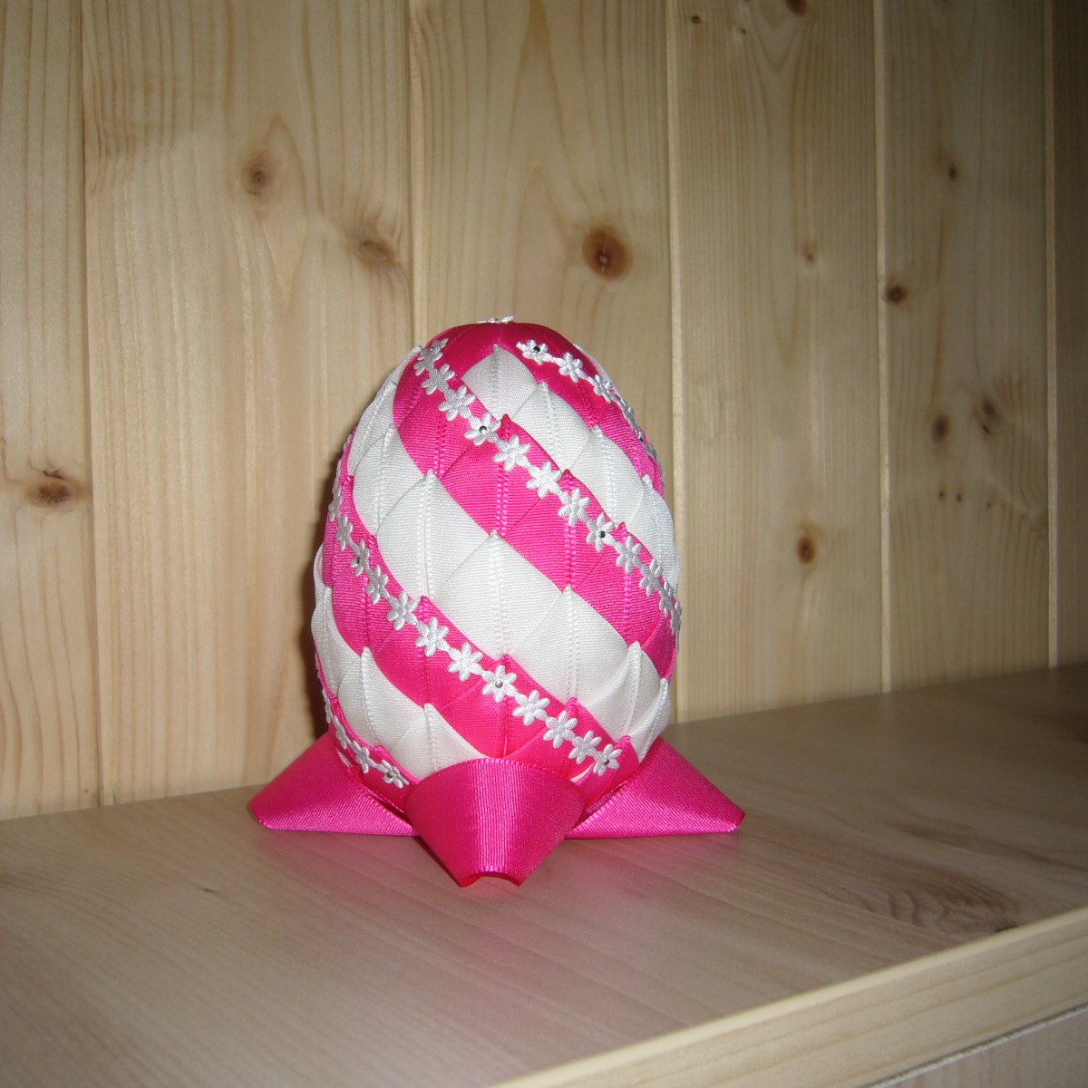 Polystyrenové vejce je zdobeno stuhami v barvách sytě růžové a bílé