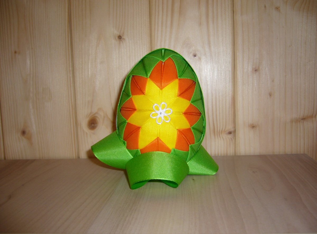 Polystyrenové vejce je zdobeno stuhami v barvách žluté, oranžové a zelené. Dozdobeno barevnou stuhou a bílou kytkou.