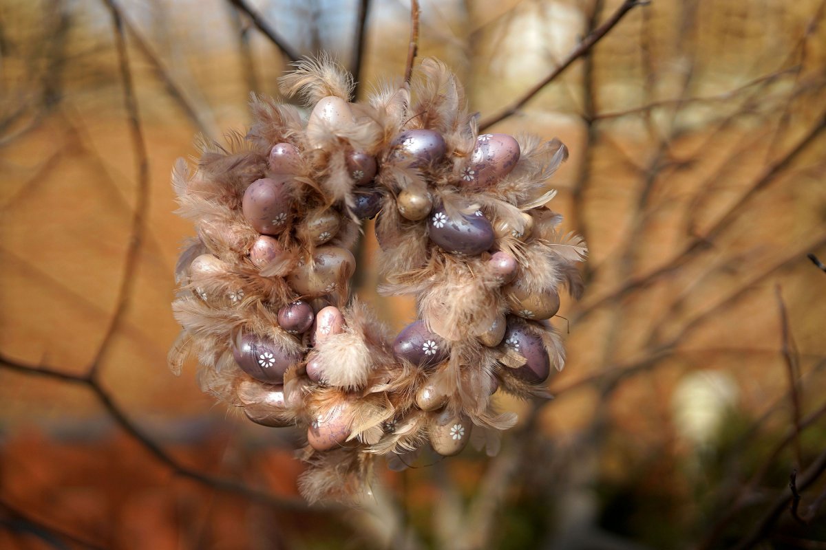 Jemný velikonoční věnec s metalickými plastovými vajíčky ve dvou velikostech a se spoustou peříček.