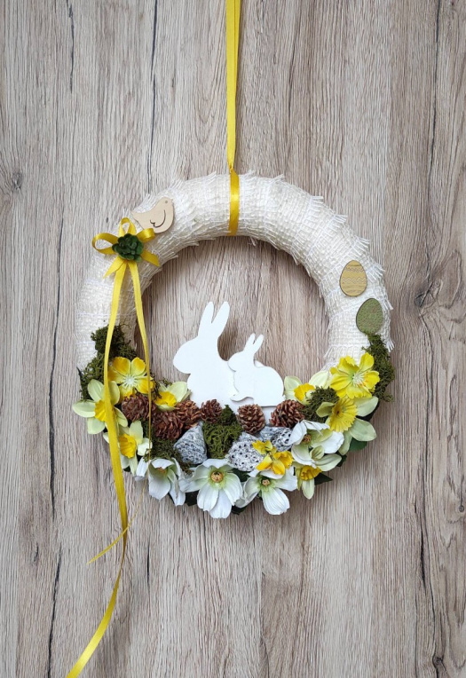 Krásný velikonoční věnec do žlutobílé barvy střední velikosti, průměr cca 28 cm. Je ozdoben kvalitními látkovými květy krásenek a narcisů, suchými exotickými plody, dřevěnými zajíčky a dalšími přízdobami. Je možno jej zavěsit na stěnu nebo na dveře.