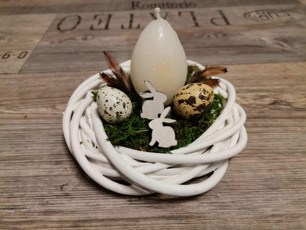 Velikonoční věneček o průměru 15cm se svíčkou ve tvaru velikonočního vajíčka.