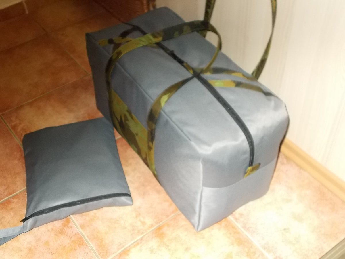 Kabela je ušita z šedé látky odpuzující vodu, ozdobena maskáčovou látkou .