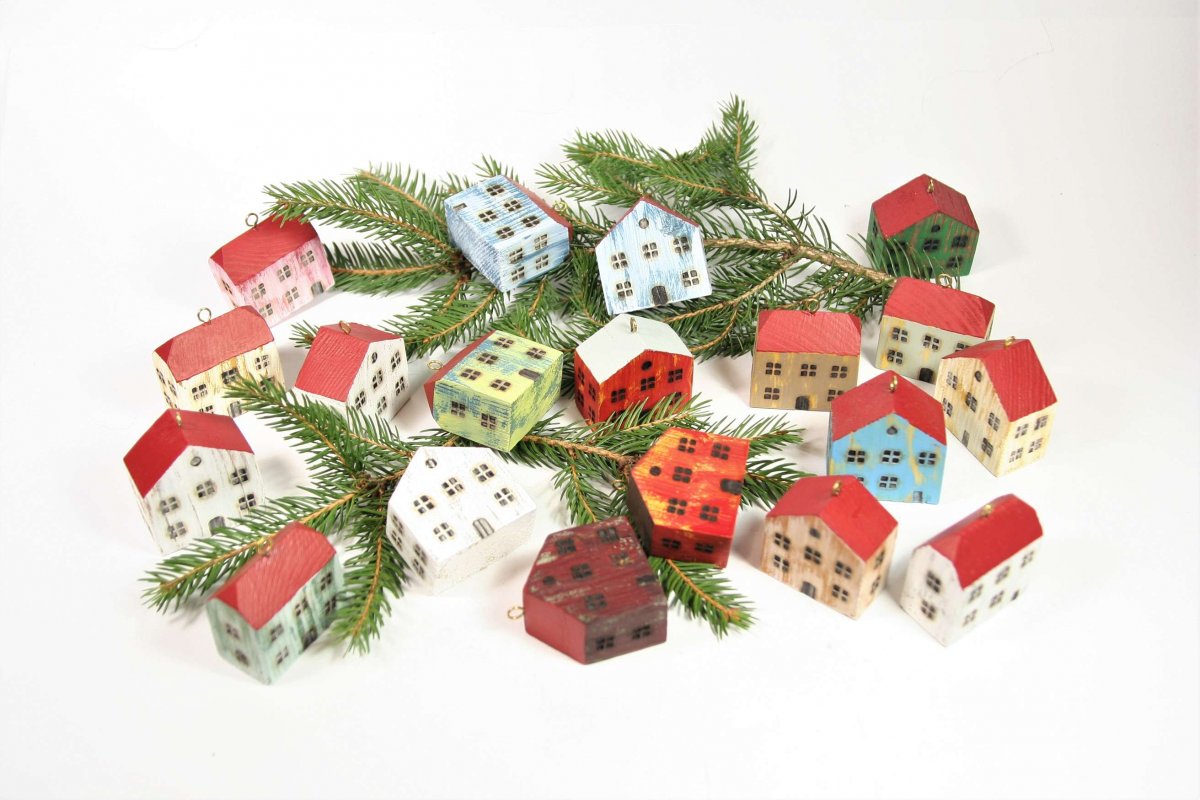 Sada dřevěných různobarevných domečků ze smrkového dřeva s ručně vyrobeným očkem z mosazného drátu k zavěšení.