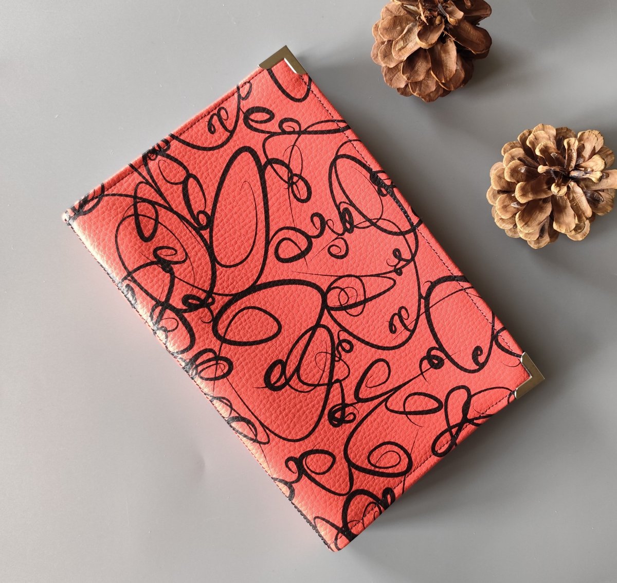 Vnější část karis obalu je ušita z umělé koženky, na vnitřní straně je bavlněná látka. Celý obal je vystužený, opatřen kovovými růžky a gumou proti otevření. Uvnitř se nachází průhledná kapsa, kam je možné vložit poznámky nebo kartičky podle potřeby.