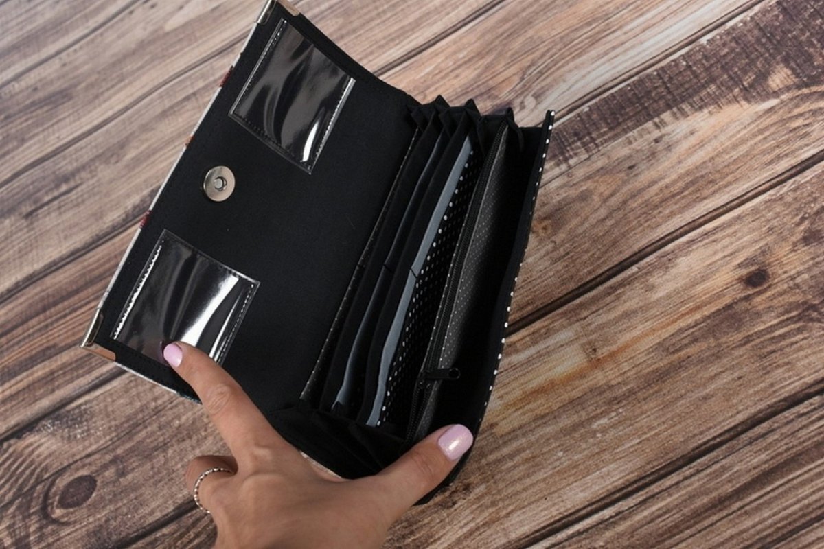 Velká peněženka ušitá z krásné zahraniční designové látky.  Pevně vyztužená a opatřená kovovými rohy.
