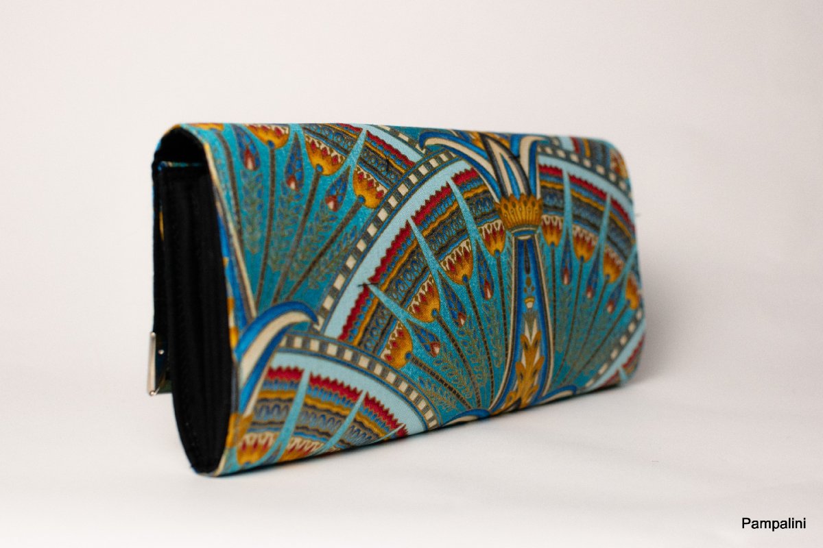 Velká peněženka ušitá z krásné zahraniční designové látky. Pevně vyztužená a opatřená kovovými rohy.
