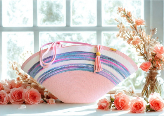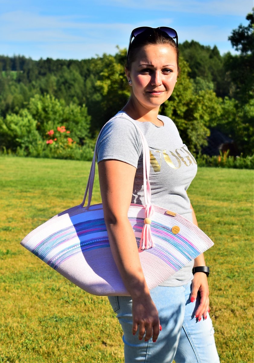 Velká pudrovvě růžová letní barevná plážovka z bavlněných přízí s výšivkou Velikost šířka 60 cm, výška 27 cm, délka ucha 60 cm Dřevený štítek Hand made. Moc hezky kombinovatelné s barevnými klobouky