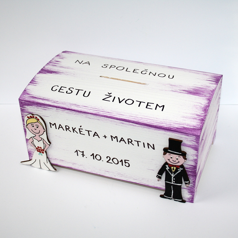 Dřevěná pokladnice je pečlivě opracovaná, ručně malovaná akrylovou barvou a decentně žíhaná. Dozdobená je dvěma dřevěnými výřezy nevěsty a ženicha. Rozměry kasičky cca 19,5 x 11,5 x 9,5 cm, výška novomanželů 8 cm.