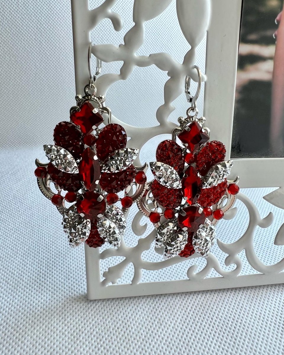 Nádherné ručně vyráběné náušnice s červenými a stříbrnými kamínky.Velikost: 4 x 5,5 cm (+ zapínání)Tento druh náušniček dodávám v krabičce.