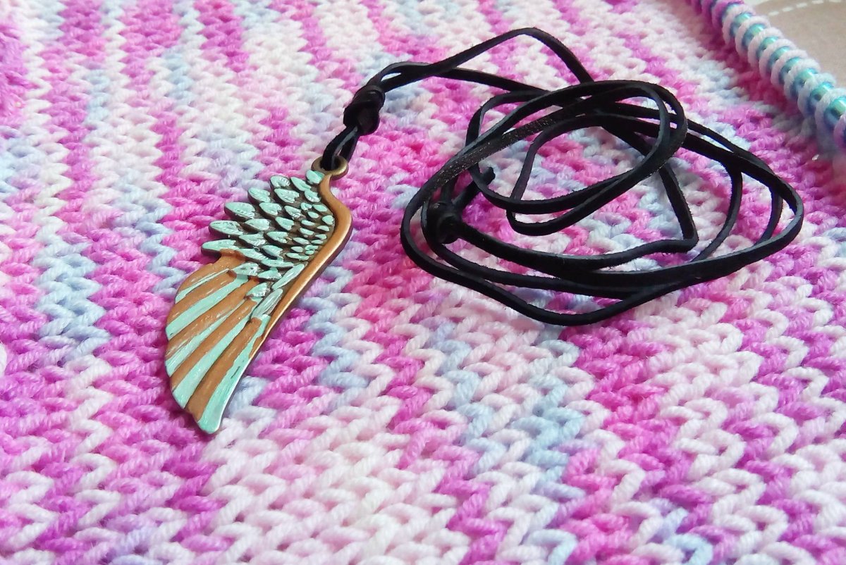 Dobarvený kovový přívěsek na kožené šňůrce (délka cca 70 - 90 cm).
