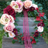 Velký věnec z přírodního neloupaného proutí s růžovými hedvábnými růžemi se zelenými středy, růžovými a vínovými květy růží, mini pivoněk a kvítky hortenzie