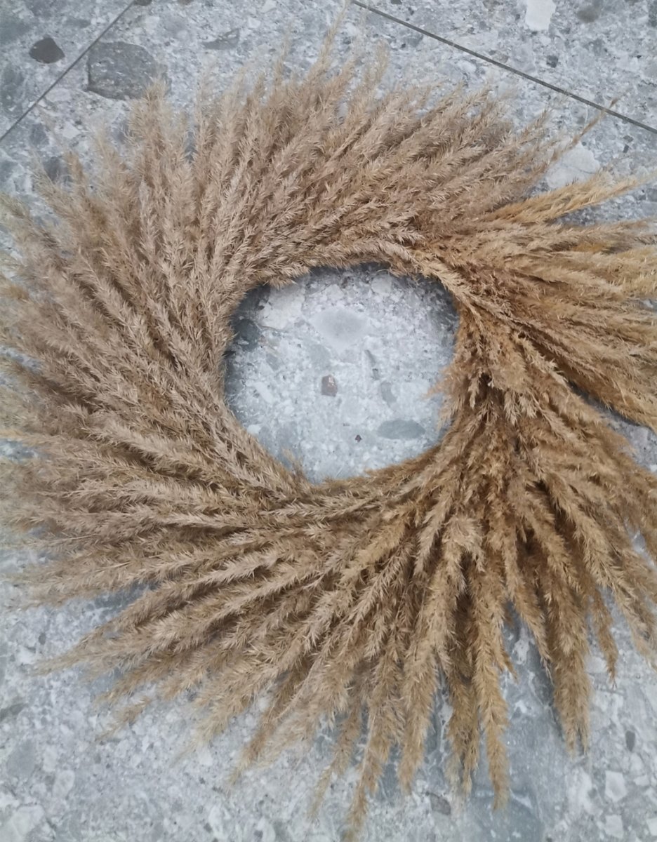 Máte rádi boho styl? Tak je pro vás tento celoroční věnec ideální. Jedná se o přírodní věnec, který je navázán na kovový kruh. Vyhotoven je navázáním třtiny křovištní drátkem na kruh. Průměr je cca 55-60cm.