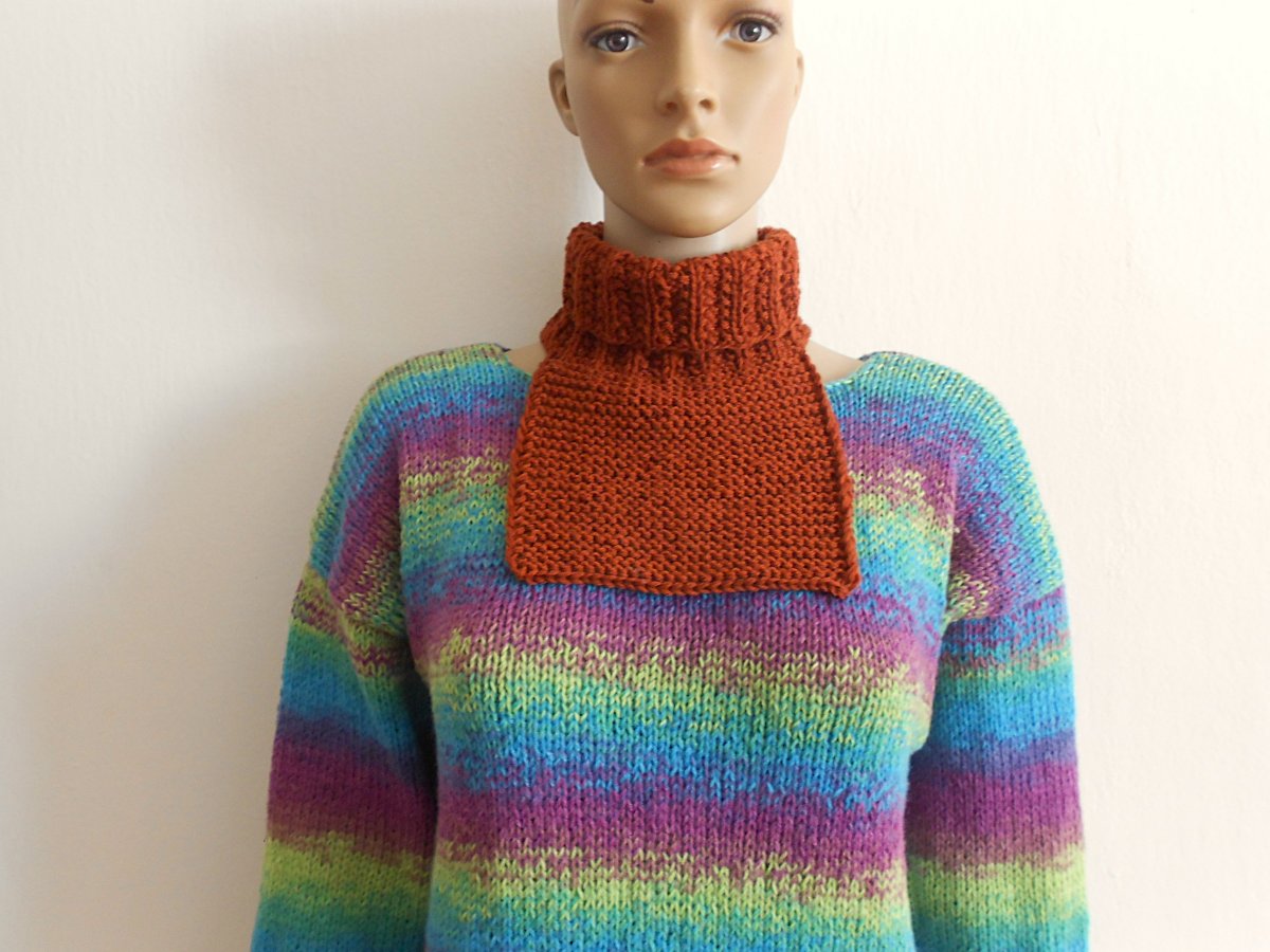 Ručně pletený, pružný, velký nákrčník, rezavý, obvod 40-62cm, vrchní díl se může ohrnout - viz. 2. fotografie, spodní díl šířka 18 cm, délka 14 cm. Pánský, dámský.