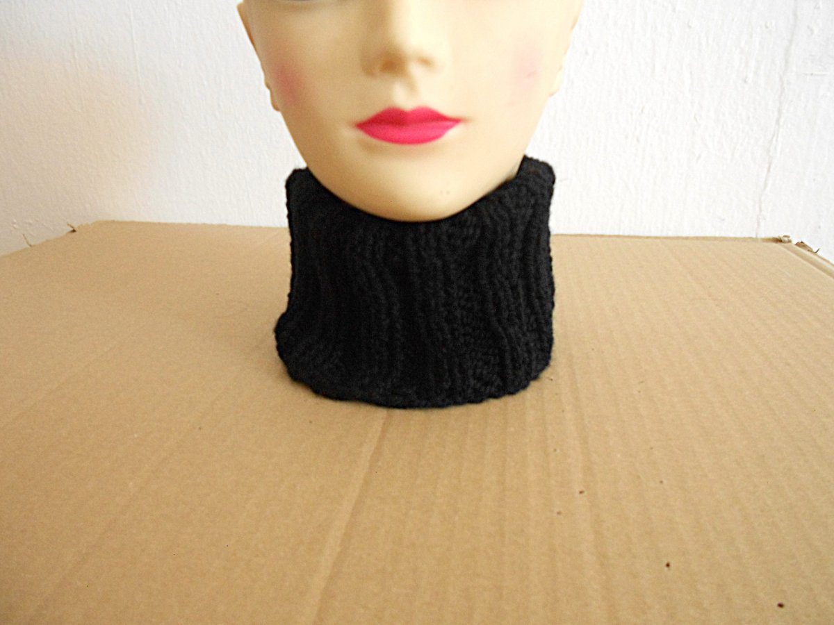 Ručně pletený, větší nákrčník, dvojitý, výšku si můžete přizpůsobit ohrnutím. Velmi pružný. Materiál 30% vlna, 70% akryl, černý. Doporučuji ruční praní, při praní v pračce použít program na vlnu.