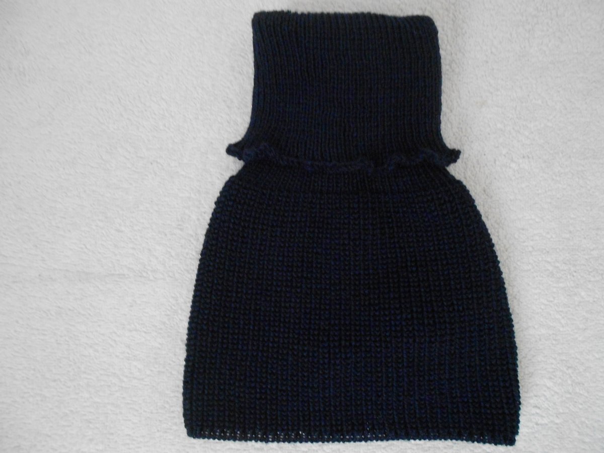 Strojově pletený, ručně dokončený, větší nákrčník. Velmi pružný. Materiál 80 vlna, 20% akryl, tmavě modrý. Doporučuji ruční praní, při praní v pračce použít program na vlnu.