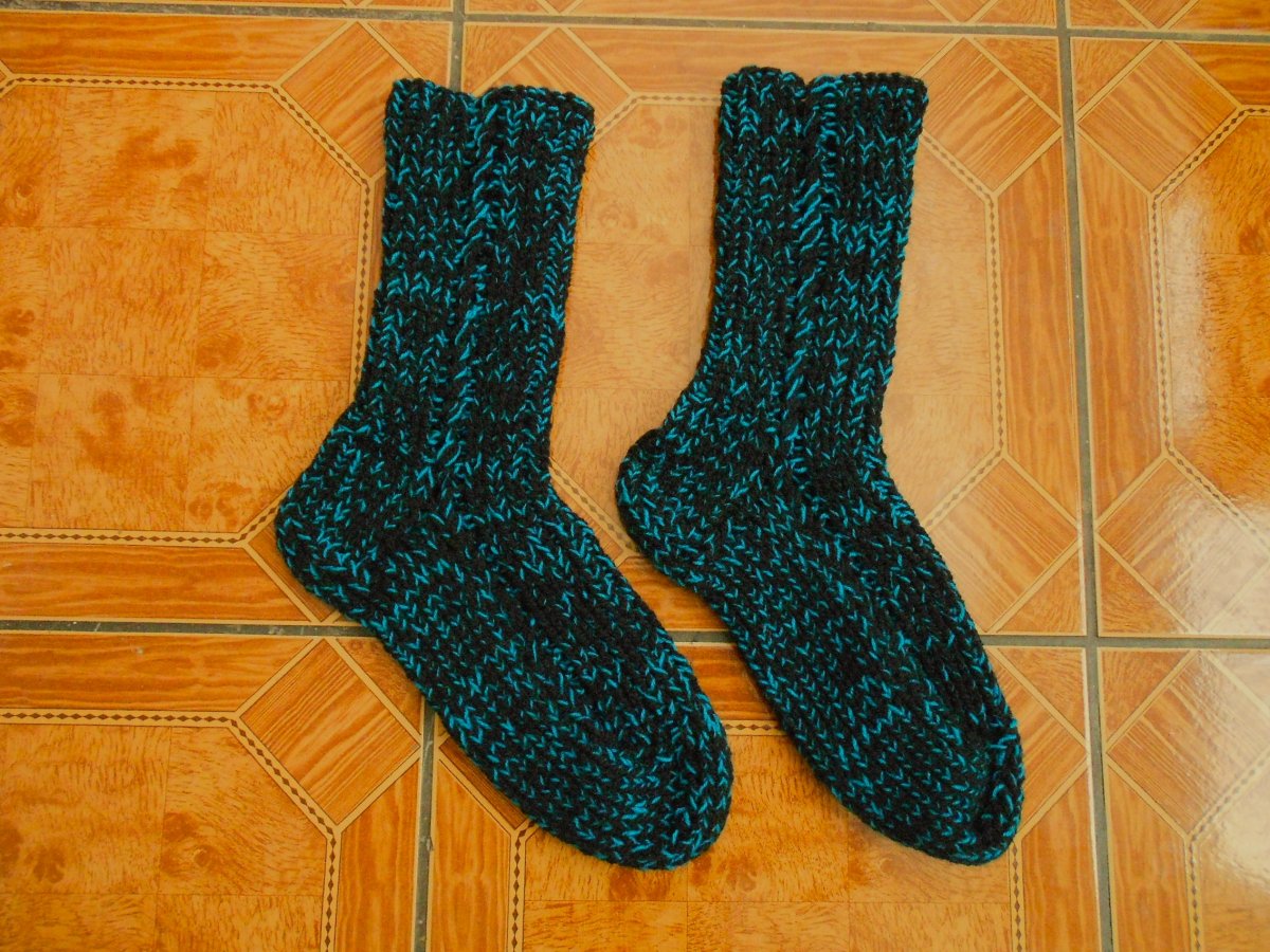 Ručně pletené, velmi teplé, bezešvé ponožky. Velikost 46-47, tyrkysová+černá, pružné, nestahují nohu, pletené ze silné příze 50% vlna, 50% akryl. Doporučuji jemné praní.