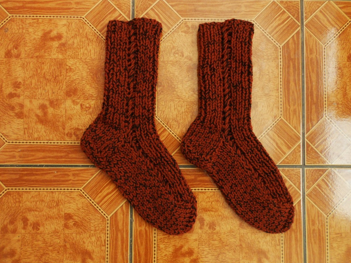 Ručně pletené, velmi teplé, bezešvé ponožky. Velikost 46-47, rezavá+černá, pružné, nestahují nohu, pletené ze silné příze 50% vlna, 50% akryl. Doporučuji jemné praní.
